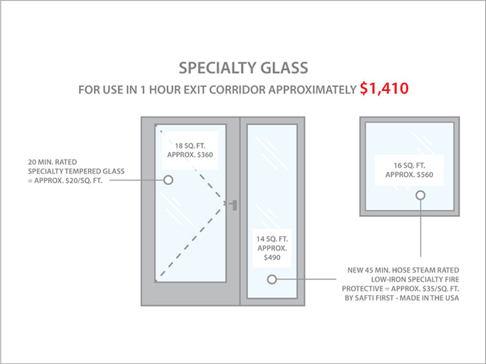 The following examples highlight the savings in a typical 1 hour exit corridor. This first assembly uses specialty glass in the 20 minute door and the new low-iron 45 minute rated with hose stream specialty fire protective glazing throughout the other openings.