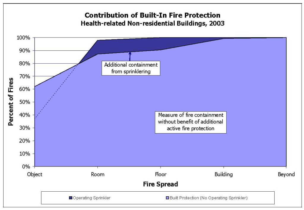 In 2010, the National Fire Protection Association (NFPA), an enthusiastic sprinkler system advocate, published a report called U.S. Experience with Sprinklers and Other Automatic Fire Extinguishing Equipment. NFPA research found that when sprinklers are present in the fire area, they operate in only 93% of all reported structure fires. According to the NFPA, when sprinklers fail to operate, the reason most often given (53% of the failures) was shutoff of the system before the fire started, which may occur in the course of routine inspection and maintenance. Other leading reasons for sprinkler failure include: an inappropriate system for the type of fire (20%); lack of maintenance (15%); and manual intervention that defeated the system (9%). Given the margin of sprinkler failure, every fire protection strategy for a healthcare facility should incorporated an alternate means of built-in or passive fire protection in order to avoid dire consequences for both patients and workers.