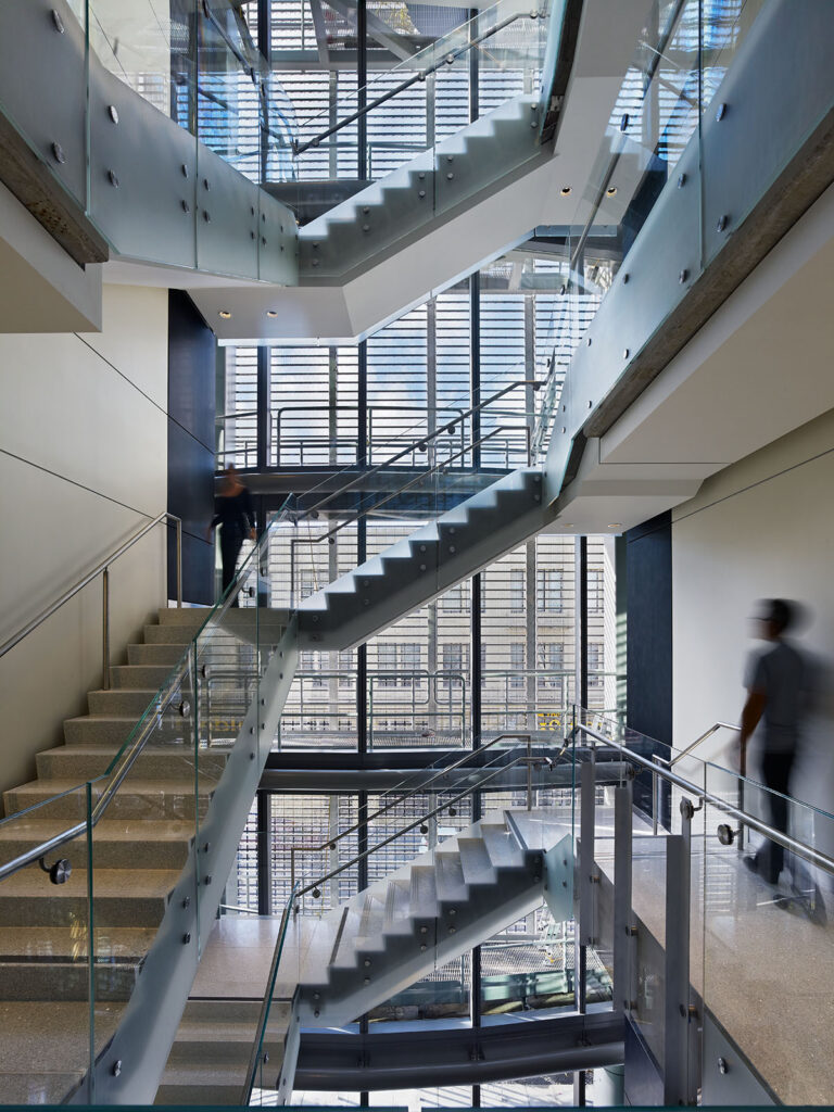 “The architects wanted an open stairwell so that the natural light coming from the art installation and glass exterior could penetrate further into the building,” says Adam Bird, the project manager from Webcor. “However, since this was an exit enclosure, it also needed to be fire rated up to 2 hours.”