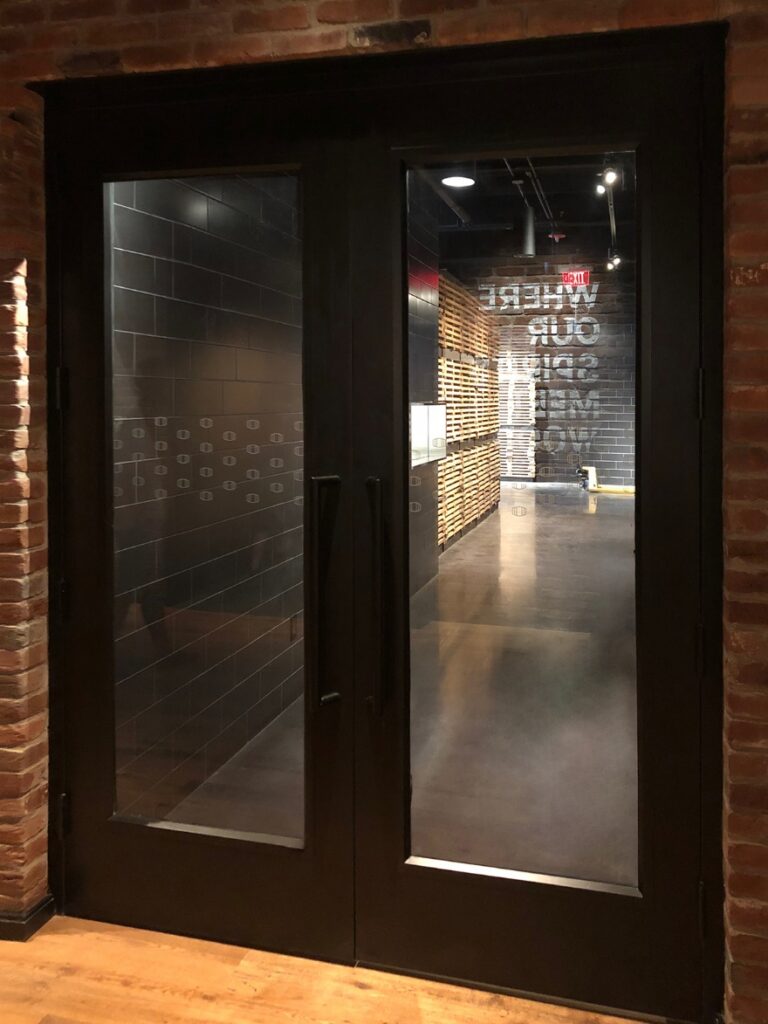 Fire resistive glazing was also used to create drama and suspense between the Welcome Area and the sky-lit atrium, which houses the ‘heart’ of the distillery. “The client wanted to bring diffuse light from the atrium into the Welcome Area, and had wanted this signature wall to be a dramatic, lit element within the space that would celebrate the brand’s founder. Because retail is on the other side of this glass wall (which is the end of the tour), we didn’t want tour guests to see the final dramatic reveal of the still and the 4-story atrium until the very end,” says Ed. “Thus, the translucent film obscures the view, allows light to flood that area of Welcome, and provides a background to the focal signature element.” To achieve this, ASTM E-119/UL 263 rated Superlite II-XL 60 with a decorative film in GPX Architectural Series Wall framing and GPX Builders Series Temperature Rise Doors were supplied for the 1-hour wall separation.