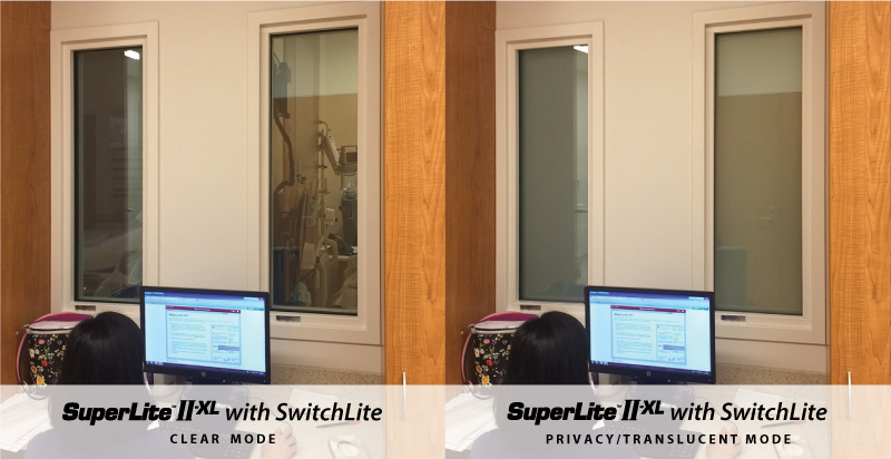 Several of these rooms required a nurse’s station situated outside of the room to monitor patients during their recover from surgery. There are times when privacy is required or desired as well, so the architects specified SwitchLite Privacy Glass for these rooms. In the past, curtains or external window blinds would have been used, but were not chosen because they were determined to be more maintenance prone and tend to accumulate and trap dust and other allergens. Glass with integrated blinds are also available, but the architects wanted the ease of control and the high-tech look of electronic privacy glass that goes from completely clear to complete privacy at a flick of a switch.