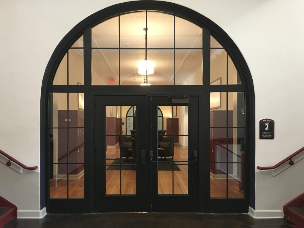 For the other 1-hour exit enclosures in the building that did not haved arched tops, SuperLite II-XL 60 in GPX Architectural Series framing was used in the transoms and sidelites to create a 1-hour fire resistive assembly. Again, SuperLite II-XL 60 was also used in the door vision panels in order to exceed 100 sq. inches in the door vision panel.