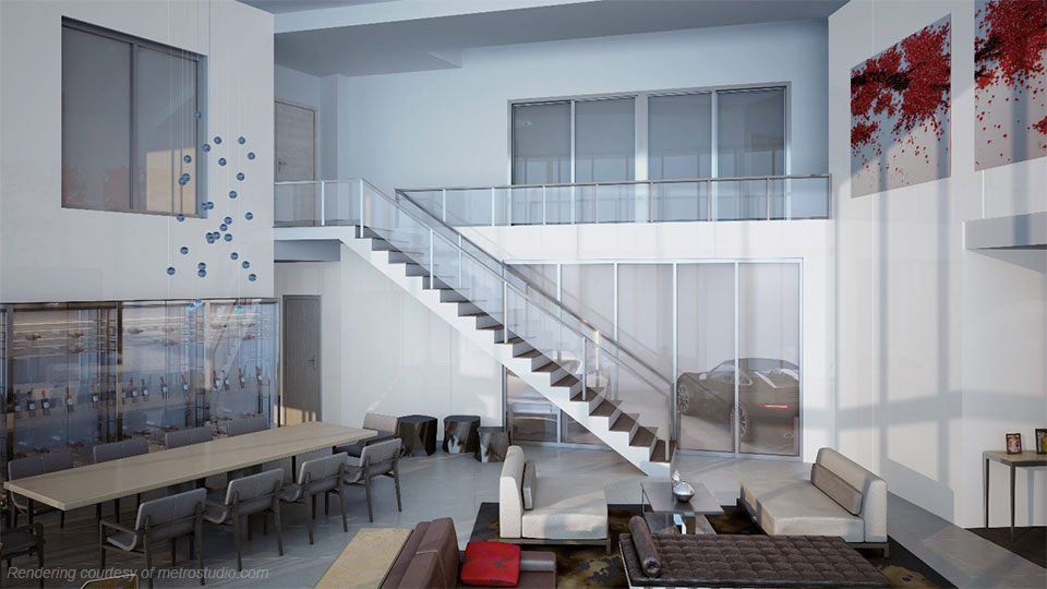 In Section 406 of the IBC, a one hour separation is required between a parking garage and dwelling unit. However, since the sky garages for each unit are connected to the 2-hour elevator shaft, the separation between the garage and the living space must follow the more stringent 2-hour fire resistive requirement. To meet code and enable residents to view their cars from their living room, SAFTI FIRST® supplied SuperLite II-XL 120 in GPX Architectural Series Framing for all of the units.