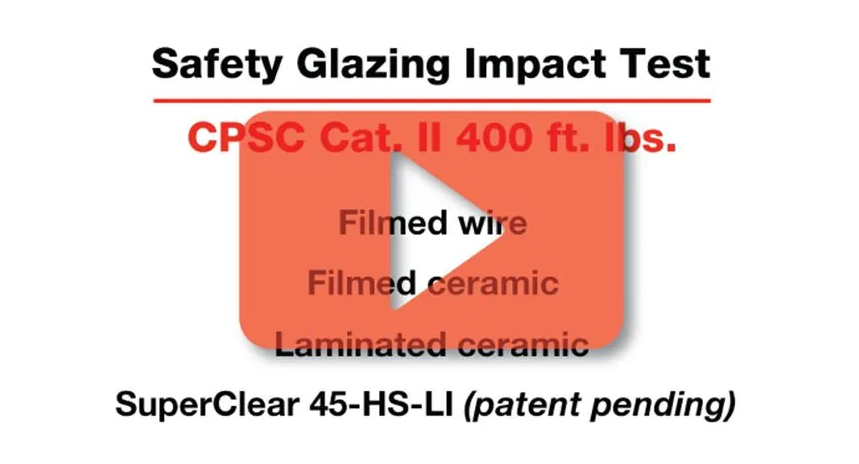Unlike glass, ceramic glass by itself cannot be tempered to meet any impact safety requirement. Thus, ceramic suppliers were now forced to provide public safety by filming or laminating ceramic glazing to provide a safe product for the public. This forced action to provide a safe product further added to the cost of ceramic. Now they had a fire rated product that was much more expensive, still not clear, as all ceramics have an amber tint, and although now meeting the safety requirements broke easily on impact. This meant that even if filmed or laminated the end user would incur increased maintenance costs making it an even more expensive glazing choice. Click on the image below to see a short video showing how filmed wire, filmed ceramic, laminated ceramic and our new SuperClear 45-HS-LI performed in a CPSC Cat. II safety impact test.