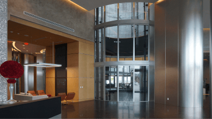 To meet fire rating code requirements, SAFTI FIRST® provided a segmented, 2-hour glass wall using SuperLite II-XL 120 in GPX Architectural Series Framing to enclose the elevators. The 2-hour segmented wall can be seen from lobby and spans several levels.
