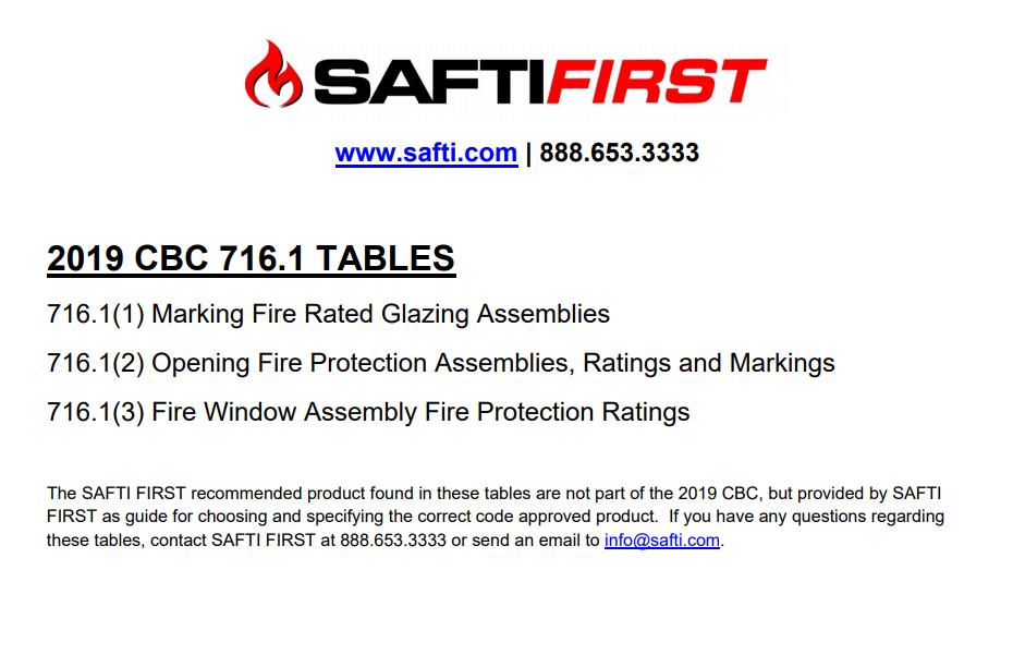 The 2019 California Building Code 716.1 Tables show the correct and code approved applications for fire rated glass.