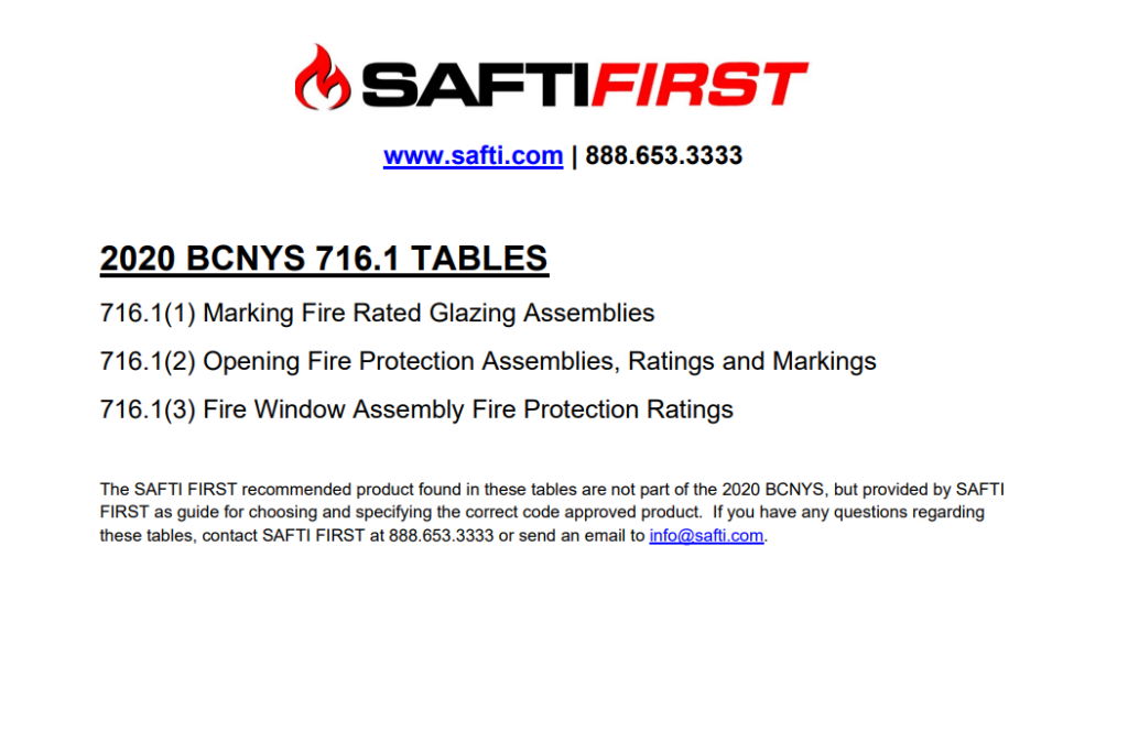 The 2020 Building Code of New York State 716.1 Tables show the correct and code approved applications for fire rated glass.