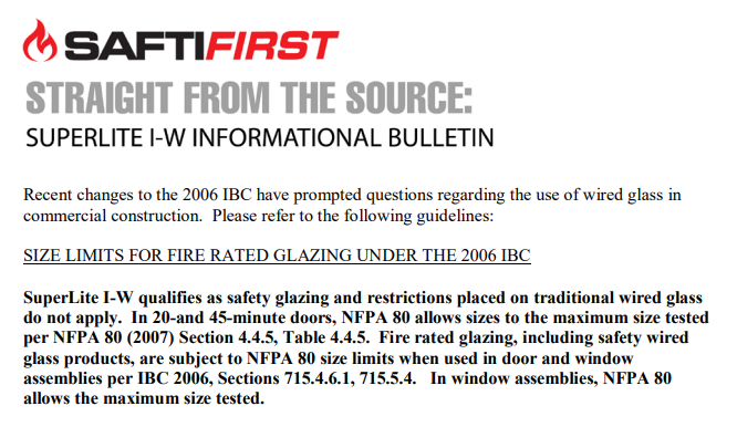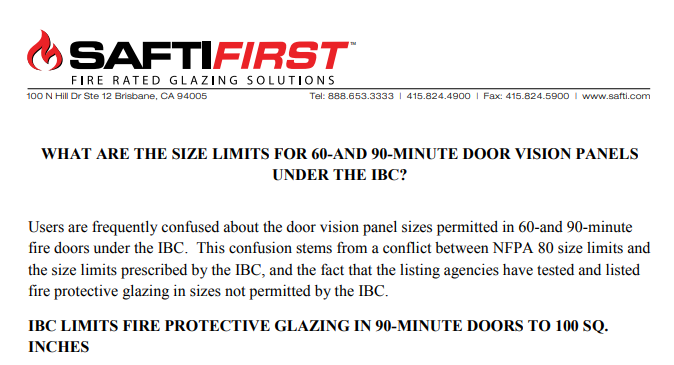 This document clarifies the confusion surrounding the door vision panel sizes permitted in 60 and 90 minute doors based on current IBC and NFPA requirements.