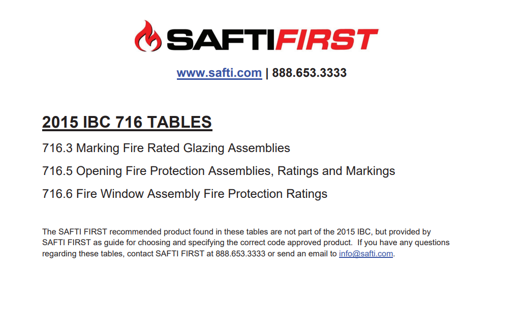 The 2018 version of the Chapter 716 Tables that show the correct and code approved applications for fire rated glass.