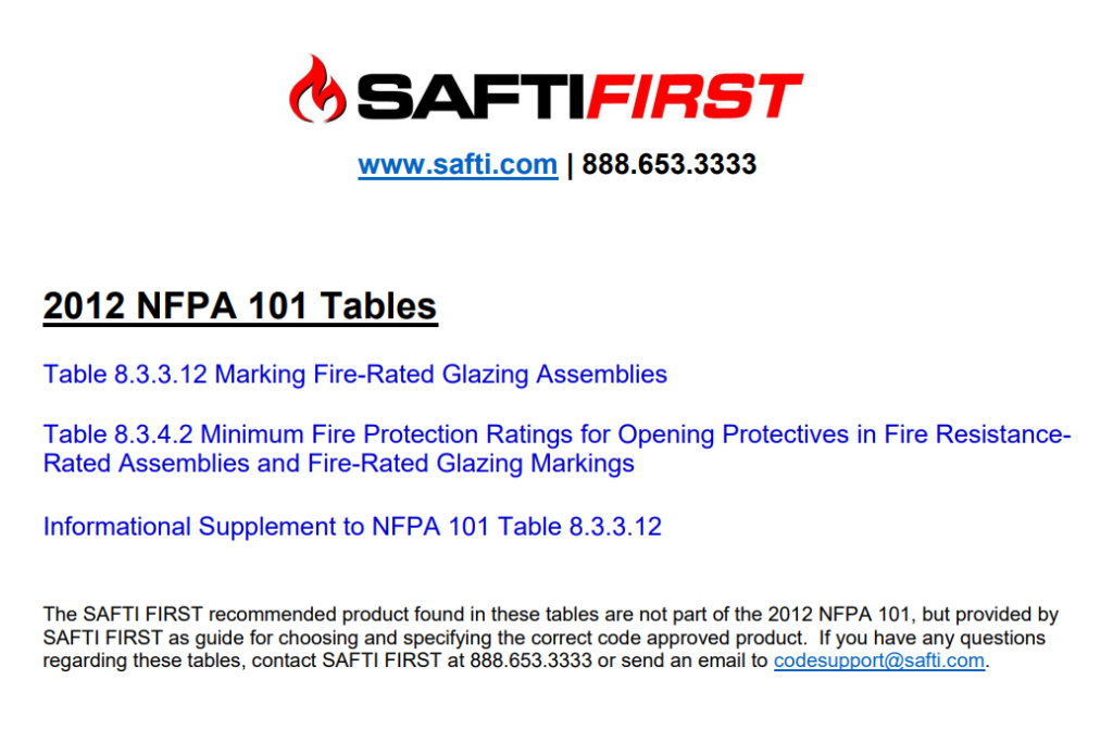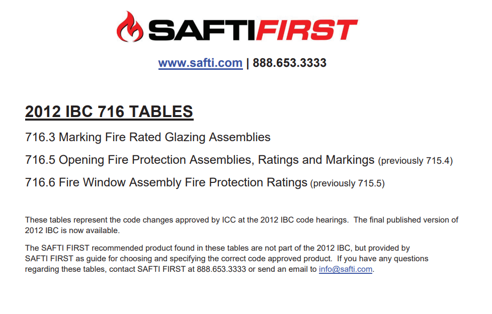 The latest version of the Chapter 7 Tables that show the correct and code approved applications for fire rated glass